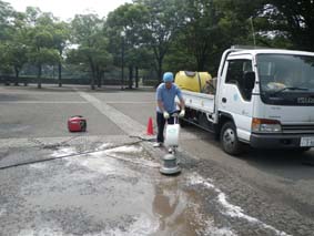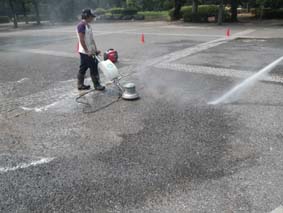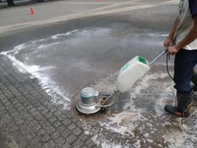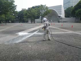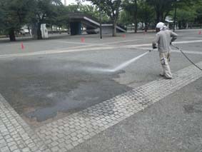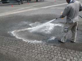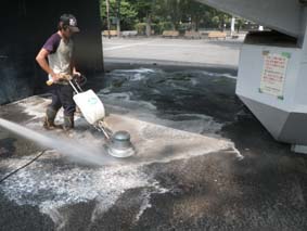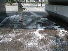まずは高圧洗浄機でざっと表面をぬらした後に洗剤を使って汚れを落としていきます