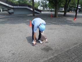 機械作業と平行して昨晩の簡易清掃で集め切れなかったゴミを拾っていきます