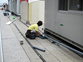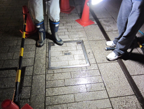 給水管の取り出しや排水口はカラーコンとコーンバーで囲い、なおかつシートで覆い見た目と匂いの軽減に努めます
