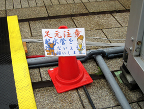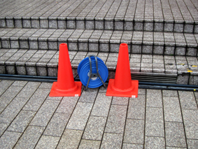 コードリールも来場者の方が引っ掛けると危険ですので、カラーコーンで目印を付けました