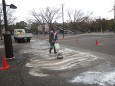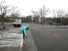 汚れがひどいところは機械を使い、機械が使いにくいところはデッキブラシ等で汚れを落とし、