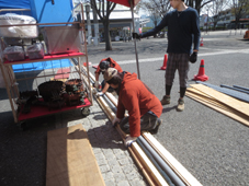 左:区画割りをしつつ・・・右:材料をトラックから降ろします