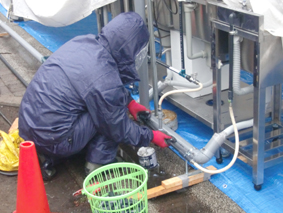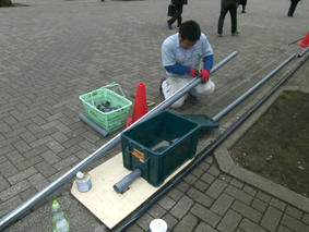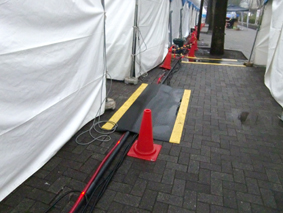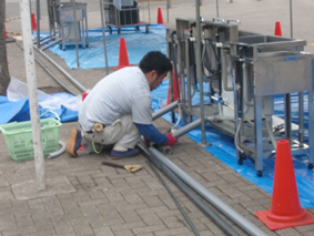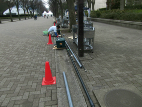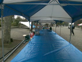 配管と同時進行で会場にテントの設営をします 必要以上に会場を汚さないためにブルーシートで養生します