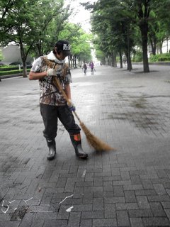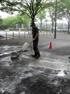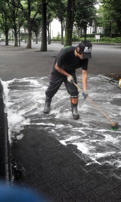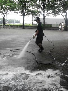 まずは掃き掃除から行い、高圧洗浄機で洗います その後高圧洗浄機では落ちない部分をデッキブラシで落とします