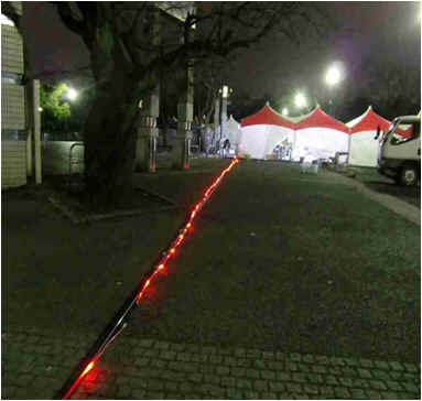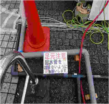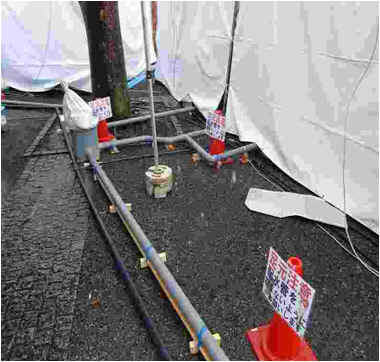 設置後の配管を参加者の邪魔にならないようにするためと、来場者への安全を最大限に考慮しながら、照明やカラーコーン等を使用して養生しています