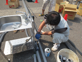 シンク等の厨房機器が到着後、すぐに配管作業が始まります