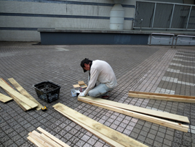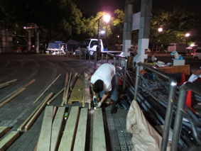 配管作業中に別班が横断部分の養生を製作します