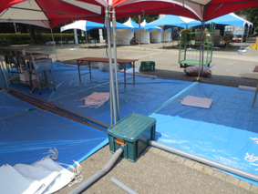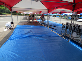 テント設営後は養生にブルーシートを敷きます